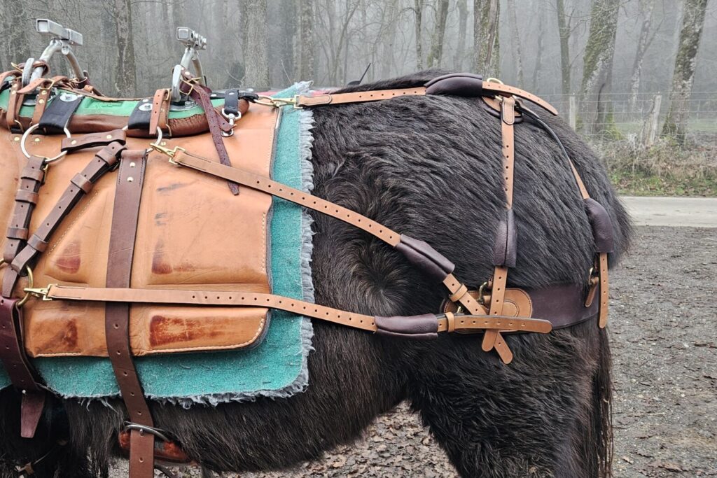Le réglage de l’avaloir de selle ou de bât n’est pas le même que celui d’un avaloir d’attelage. La barre de fesse de l’avaloir de selle ou de bât vient se positionner plus haut, juste en-dessous de la pointe de la fesse, le but étant qu’il y ait le moins de frottements inutiles possible lors de longues journée de marche. Pour résumé, on le positionnera le plus haut possible, en évitant toutefois qu’il puisse remonter de lui-même et se retrouver sous la queue!