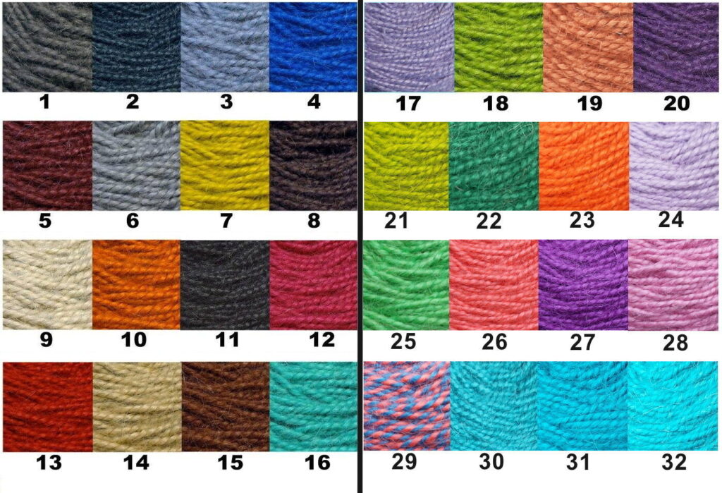 1: Gris anthracite. 2: Bleu acier. 3: Bleu délavé. 4: Bleu roi. 5: Bordeaux. 6: Gris clair. 7: Jaune. 8: Marron foncé. 9: Naturel. 10: Orange. 11: Noir. 12: Rose. 13: Rouge. 14: Sable. 15: Sorrel. 16: Turquoise clair. 17: Ultra violet. 18: Vert pomme. 19: Rouille. 20: Violet. 21: Vert acide. 22: Vert sapin. 23: Lave. 24: Lilas. 25: Lime blast. 26: Coral. 27: Violet électrique. 28: Queen pink. 29: Candy cane. 30: Teal. 31: Lagoon. 32: Lake blue.