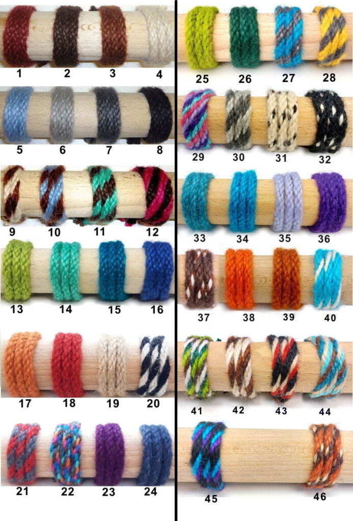 1: Bordeaux. 2:Marron foncé. 3:Sorrel. 4: Naturel. 5: Bleu délavé. 6: Gris clair. 7: Gris anthracite. 8: Noir. 9: Naturel/Sorrel. 10: Bleu délavé/Sorrel. 11: Marron foncé/Turquoise clair. 12: Marron foncé/Rose. 13: Vert pomme. 14: Turquoise clair. 15: Turquoise foncé. 16: Bleu roi. 17: Orange. 18: Rouge. 19: Sable. 20: Noir/Naturel. 21: Gris anthracite/Rouge. 22: Multicolore. 23: Violet. 24: Bleu acier. 25: Vert acide. 26: Vert sapin. 27: Gris foncé/Lagoon. 28: Gris foncé/Jaune. 29: Charlotte Unicorn. 30: Nuances de gris. 31: Yang. 32: Yin. 33: Teal. 34: Lagoon. 35: Lila. 36: Violet électrique. 37: Hawk. 38: Lave. 39: Rouille. 40: Vatnajokull. 41: Rainforest. 42: Rock’n’Desert. 43: Kaihalulu. 44: Tribes. 45: Carnival. 46: Bryce canyon.