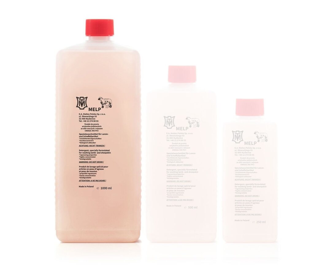 Les articles en mouton peuvent être lavés en machine, en programme délicat, maximum 30° et exclusivement avec une lessive faite pour les peaux de mouton véritable. La marque Mattes propose son propre produit: